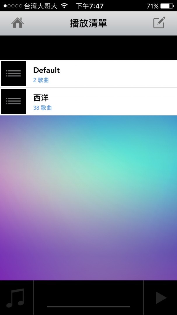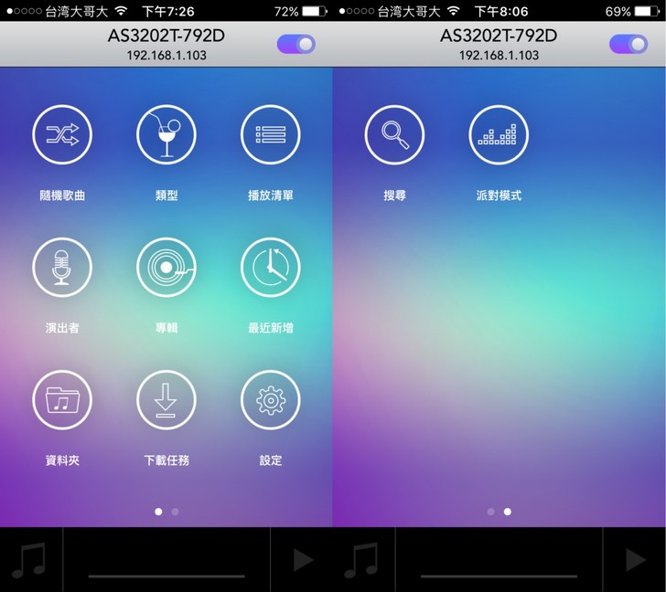 ▼設定完成後即可透過行動裝置來存取音樂檔案囉,AiMusic的介面相當的清爽,主要分成兩個選單畫面,功能都是有圖示為主文字為輔的方式呈現,淺顯易懂。