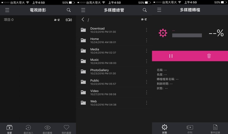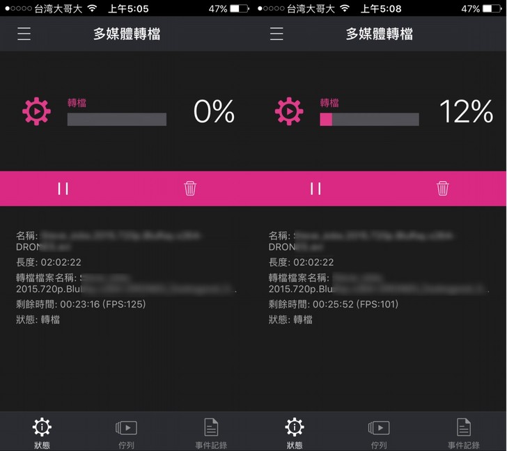 ▼手機端的多媒體轉檔過程,手機端的多媒體轉檔也可管理從電腦設定的任務,也可以從手機端上來新增轉檔任務。