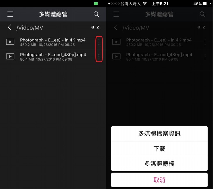 點選紅框處的點點就能選擇要下載至手機上還是轉檔喔!