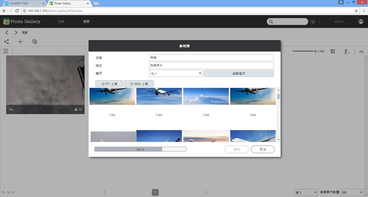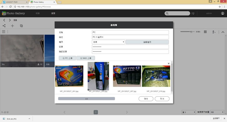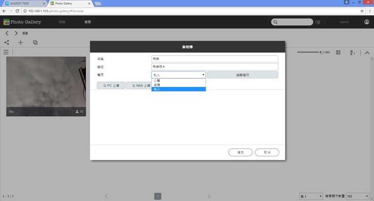 ▼點選加號即可新增相簿,相簿還可以設定為公開或者是密碼保護的設定,可以很輕鬆又具安全性的將照片分享給親朋好友;照片也可以選擇要從NAS內中的照片建立相簿或者是從電腦上來建立,蠻方便的,不過還是有個小缺點,那就是:PhotoGallery選擇照片時不能直接選取整個資料夾,如果要一次上傳資料夾的話建議使用檔案總管來整理會比較好用。