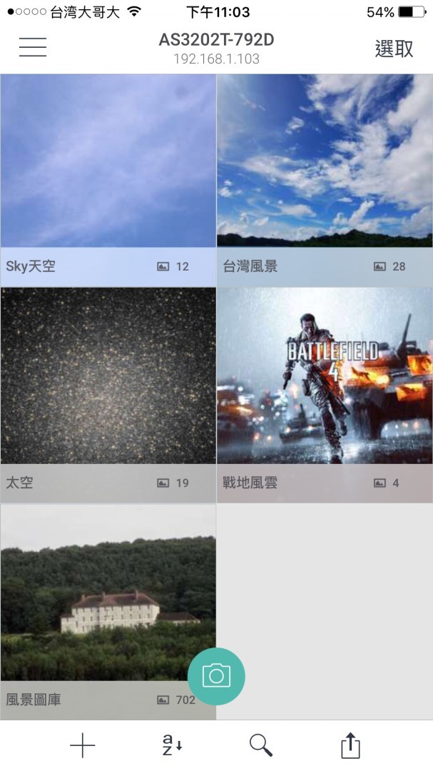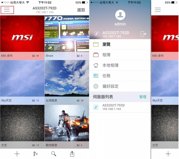 ▼連線完成就能看到NAS上的相簿囉! 對於手機的相容便利性都設計的很不錯,點選左上角的選單就能選擇瀏覽手機或NAS上的照片,還有NAS的一些設定可以做調整。