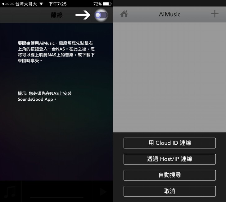 ▼AiMusic 一開啟後馬上就很貼心的出現使用提醒,連線方式一樣也有三種方式,Cloud ID、Host/IP、自動搜尋,一樣我使用最簡單的自動搜尋。