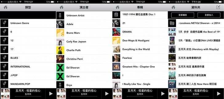 ▼歌曲專輯的分類有四種方式做表現,分別為類型、演出者、專輯、資料夾,其中我蠻喜歡演出者與專輯這兩種方式,可以讓我辛苦整理的專輯資訊呈現出來,爽度大增呀! 而且也比那冷冰冰單調預設圖片好看許多。