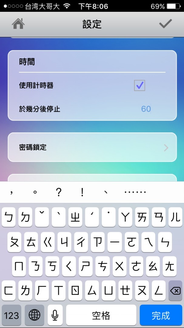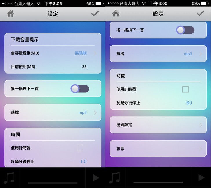 ▼AiMusic的設定項目,有著搖一搖的換曲功能、計時停止、密碼鎖定等功能,還挺多樣化的,可以調整的選項也很彈性。