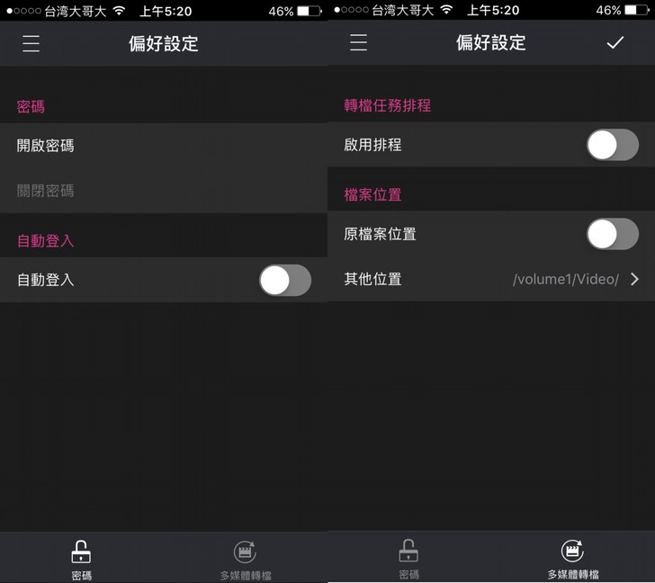 ▼偏好設定中有著NAS的登入設定還有開啟AiVideos APP的密碼;轉檔的時間排程設定等等,APP上可以調整的與使用的功能算蠻多的,不會因為是手機或行動裝置功能就被閹割掉。