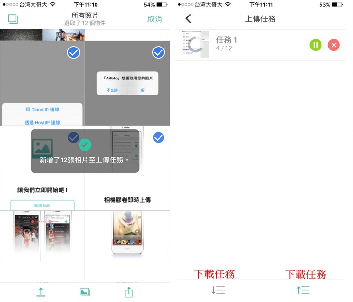 ▼可以看到出現提醒視窗告知有12張照片新增至上傳任務,打開到任務頁面就能看到目前正在上傳中的照片進度,檔案都是使用原始檔來上傳,不用擔心照片的原始畫質會被壓縮掉。