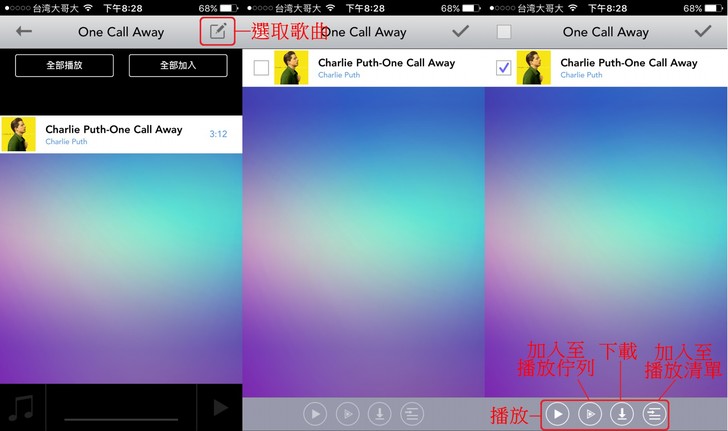 ▼行動裝置或手機一樣也可以自行建立播放清單,點選記事本的圖案,再來選取要新增的歌曲給它打勾,點選加入播放至播放清單的圖示(如下圖),這邊的表示就有些不清楚,希望下次更新時可以新增文字標示該功能的用途呀!!