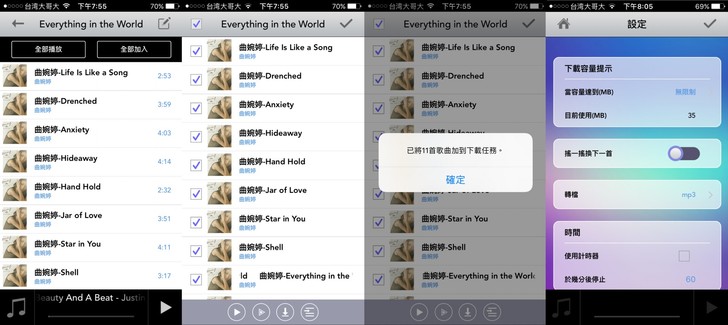 ▼歌曲下載,AiMusic提供一個蠻不錯的功能,就是可以透過下載任務將NAS上的音樂下載至手機,這樣便可以達成離線播放,下載完成後在設定中也可以看到下載所佔用的空間大小。