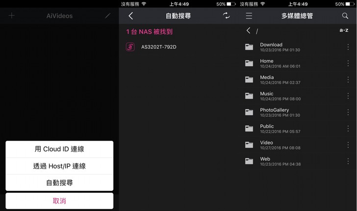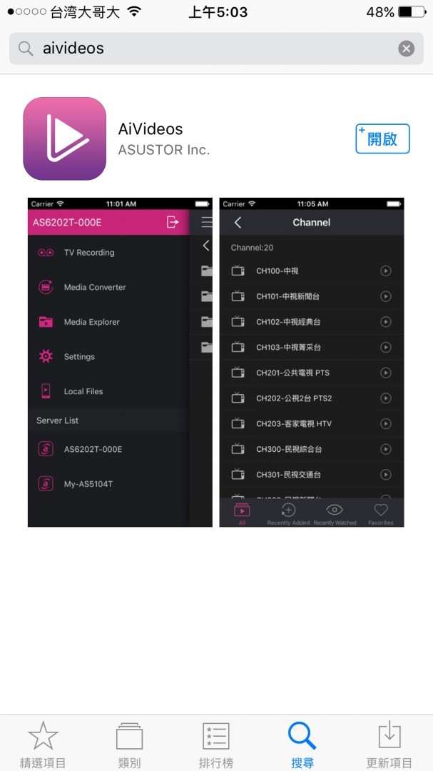 ▼AiVideos為行動裝置所使用的APP,在AiVideos能對NAS進行電視錄影的設定、轉檔選擇、多媒體播放,功能蠻實用的。一樣提供了Android與Ios兩個平台的版本。