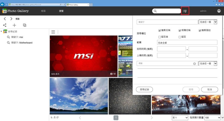 ▼進階搜尋,可以自訂條件來搜尋Photo Gallery上的照片,依照上傳日期、拍照日期都行,條件相當多樣,讓使用者能迅速的找到想要的照片。