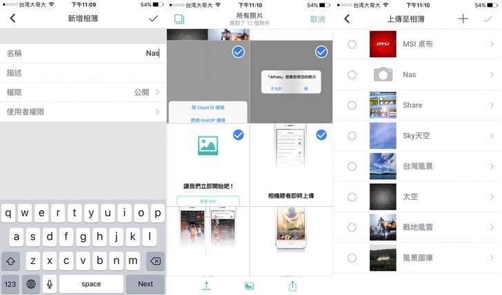 ▼手機行動裝置新增相簿,按下方的加號便會進入新增相簿的頁面,先命名相簿名稱、設定權限,再來選擇要加入的相片。然後在選擇相簿,可以看到剛剛建立的Nas相簿已經出現了,選擇相簿按下打勾。