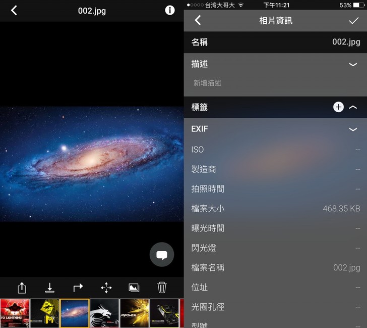 ▼照片瀏覽的介面也做得相當精緻,也可以對照片稍做修改調整,查看相片資訊EXIF都沒問題。