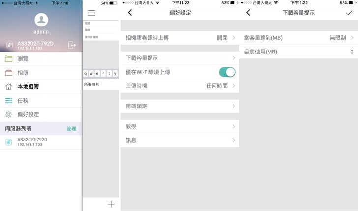 ▼偏好設定中則是能對相機膠捲的上傳進行設定;下載容量管理,當下載照片達到一定空間時會有所限制;上傳時機與網路源設定,為了防止照片上傳消耗掉行動數據的使用量,所以在這邊可以做管理;密碼鎖提供更強更安全的保護,設定了密碼之後,不用擔心手機借人或是不再手機旁,照片被看光光!
