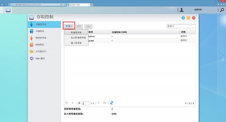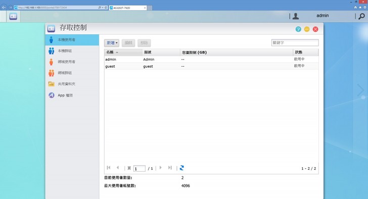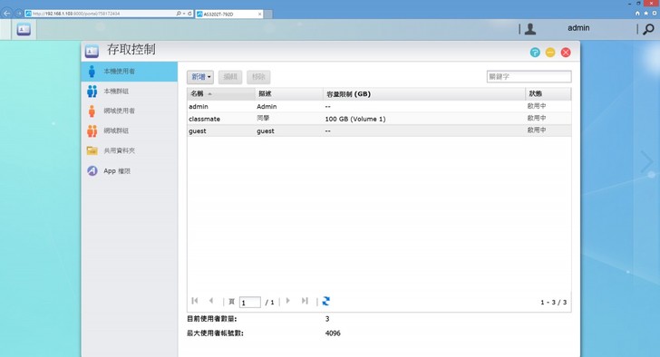 ▼開啟進入到ADM主畫面,要來新增給同學的帳號,所有的帳號管理都是在存取控制這邊做設定,基本上使用者的問題都可以在這裡做解決。