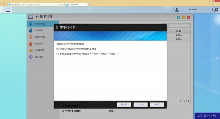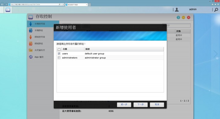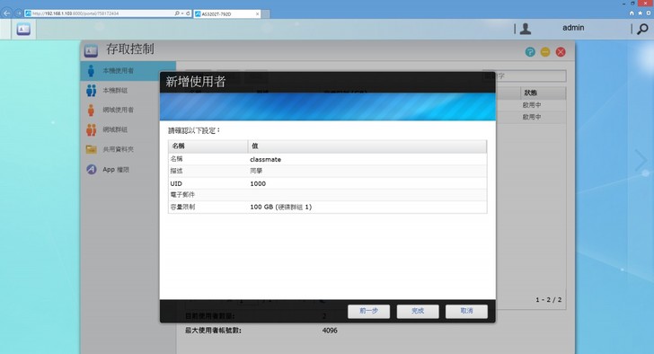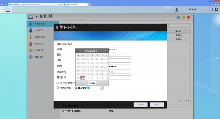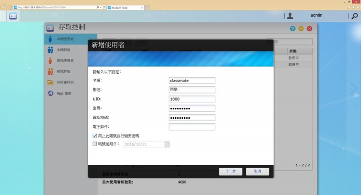 ▼輸入名稱以及密碼即可,UID部分則讓系統下去設定就好囉! 帳號還可設定有效期限與修改密碼的權限。