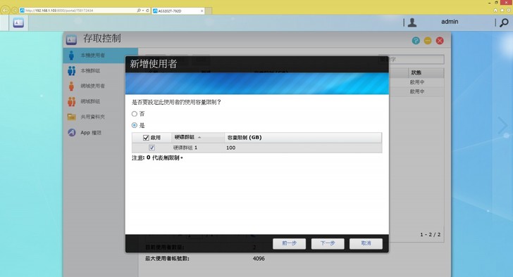 ▼對帳號做使用量的限制,依照需求下去設定,避免單個帳號佔去過多的儲存空間。