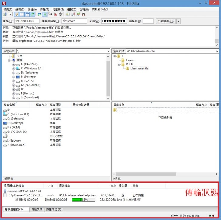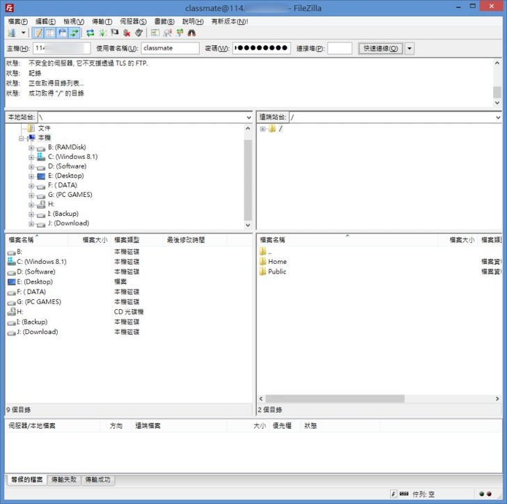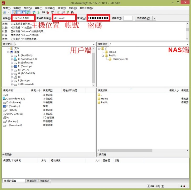 ▼先使用內網來連線試試看,使用FileZilla來做測試,輸入主機位置(NAS的IP)、使用者名稱(剛剛新增的帳號)、密碼。按下連線即可。