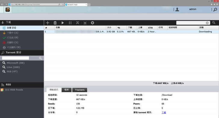 ▼設定好後就會開始執行下載任務囉! 下載任務的資訊都可以在下方查看,透過NAS來下載BT不僅方便,而且還非常的省電,還有著手機APP可以管理,比起以前下載BT真的是方便很多。