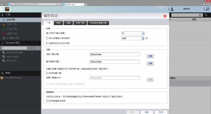 ▼偏好設定中則可設定任務的下載數量、做種時間、存放位置以及智慧資料夾功能,推播通知功能與手機上的AiDownload 做同步,當NAS的檔案下載完成後,手機端會收到通知。