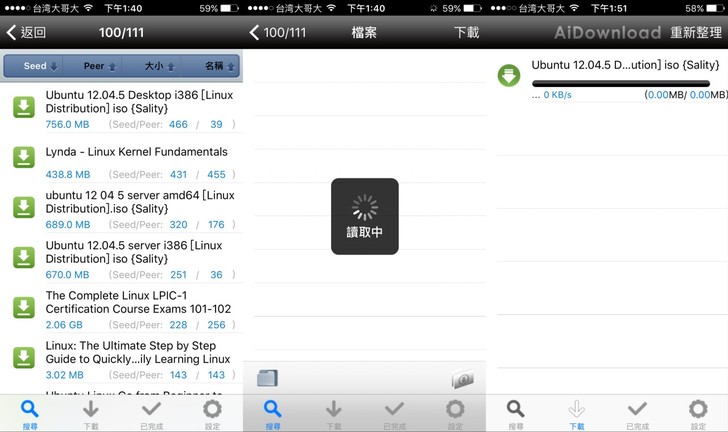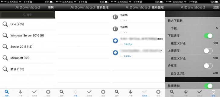▼四個主要的畫面,分別為強大的搜尋功能、下載中的任務、已完成的任務以及設定等等。