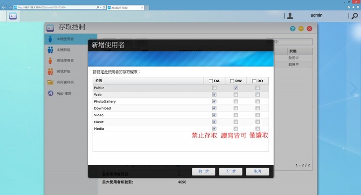 ▼設定使用者對NAS中的讀取權限,DA-完全禁止 RW-讀寫皆可 RO-只能讀而已,這邊我設定讓他只能存取Public這個資料夾。