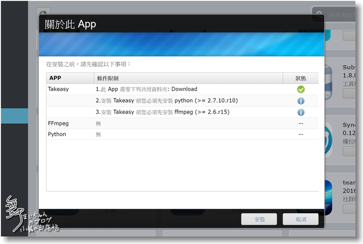 ▲立馬安裝,但安裝《Takeasy》需要先行安裝《python》和《ffmpeg》,別擔心,按下安裝後華芸會一併安裝完成。