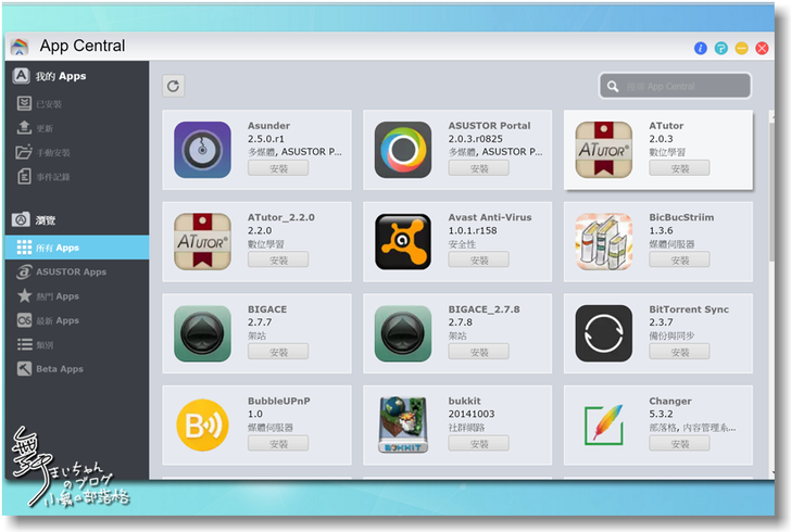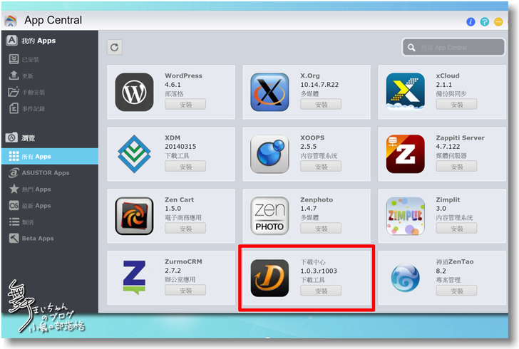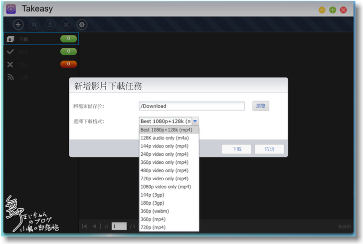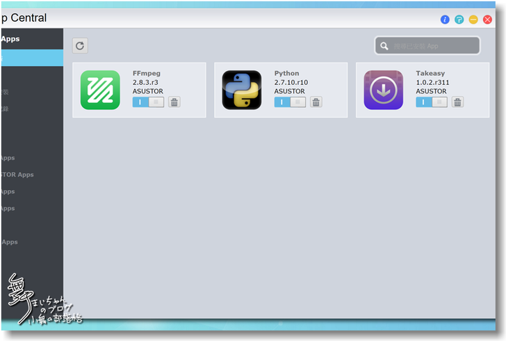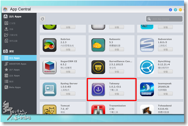 ▲對於網路影片下載收藏,ASUSTOR提供了《Takeasy》的工具程式,目前支援的網站有Youtube、Vimeo、優酷、T土豆網、Fivcd.com...等。只要在App Cental中下載安裝即可。