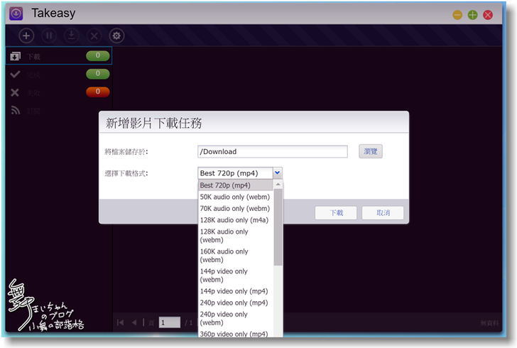 ▲然後選擇下載存放的資料夾和下載格式,這裡會判斷原始影片的解析度而定