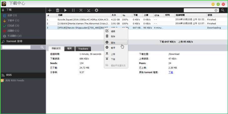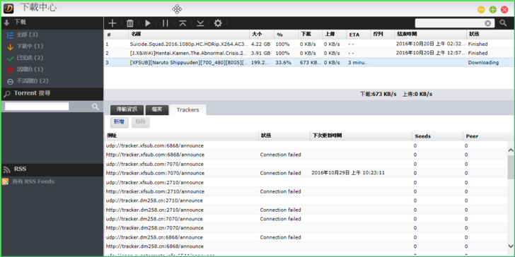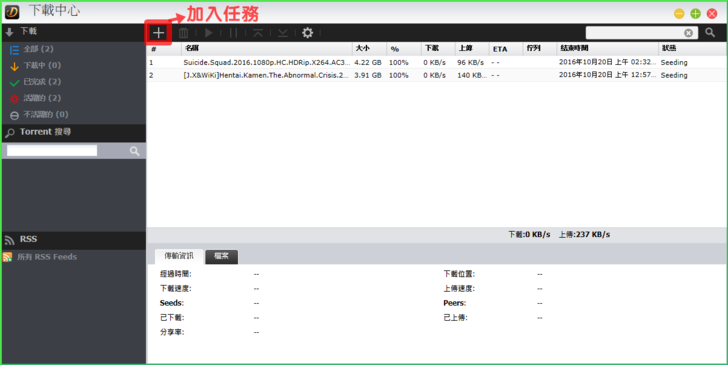 【▼】首先先來介紹下載中心,下載中心的主畫面非常的簡潔有力,左邊黑底白字的欄位為檔案的下載狀態,包含下載中、已完成、活躍狀態等,且還提供了種子的搜尋,若對透過RSS訂閱功能你可即時取得torrent網站上最新的檔案。而右邊為加入的下載任務資訊與偏好設定等。