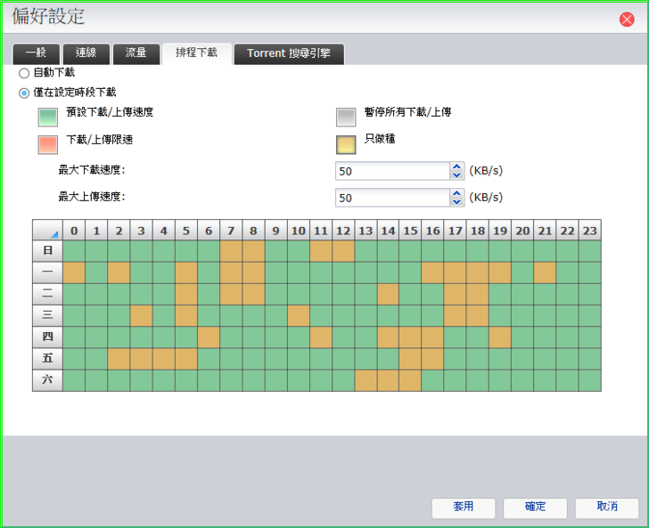 【▼】偏好設定中->排程下載,可以依據星期一到星期日24小時不同時間來限制上傳與下載速度,實用性相當高的智慧排程。