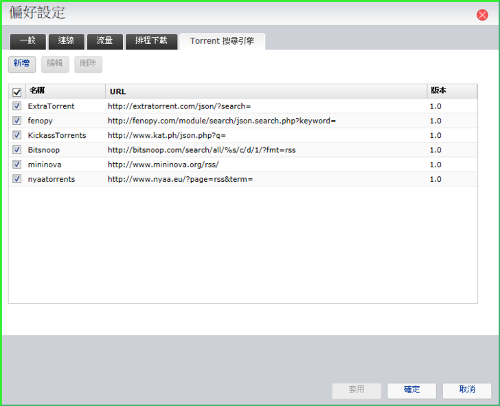 【▼】偏好設定中->Torrent 搜尋引擎可加入常見的The Pirate Bay、Torrentz、Kickass Torrents等。