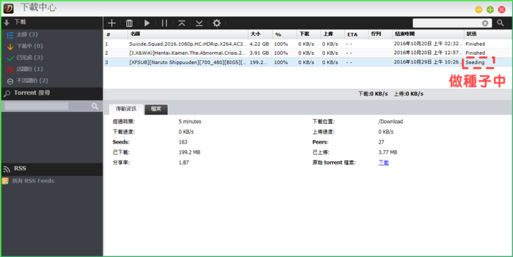 【▼】而下載完的檔案,若沒有按下停止,則會變成作種子的狀態供他人下載,此時也可以查看傳輸率與檔案資訊。