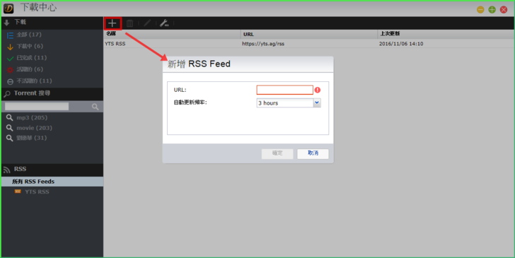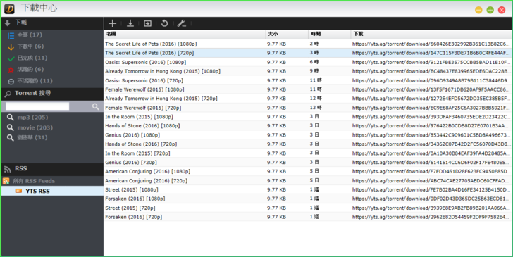 【▼】小編以YTS搜尋引擎作示範,一加入 https://yts.ag/rss 就有很多頻道顯示出來,不過更新的時間有長有短,建議選擇自動更新頻率較短的。(此一功能多用於常態性的發佈,例如下載電視影集)