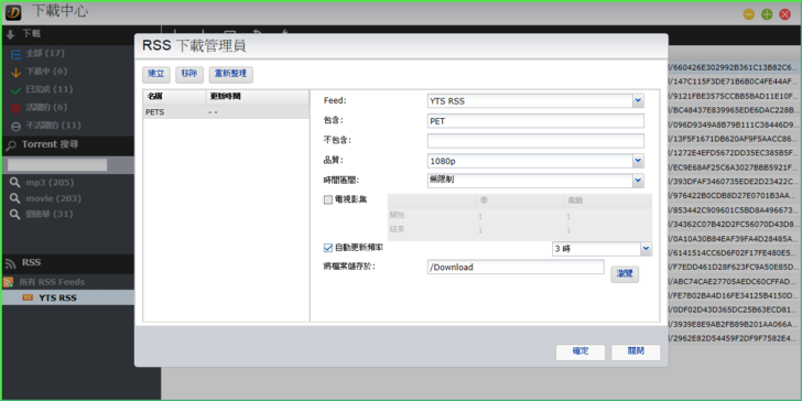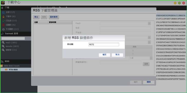 【▼】RSS 篩選器右方為所有可篩選的選項。首先請由feed下拉選單中選擇你欲設定篩選的RSS feed,你可建立關鍵字篩選來特定關鍵字字串、指定影片品質以及指定特定集數的電視影集,設好條件後請按確定完成。