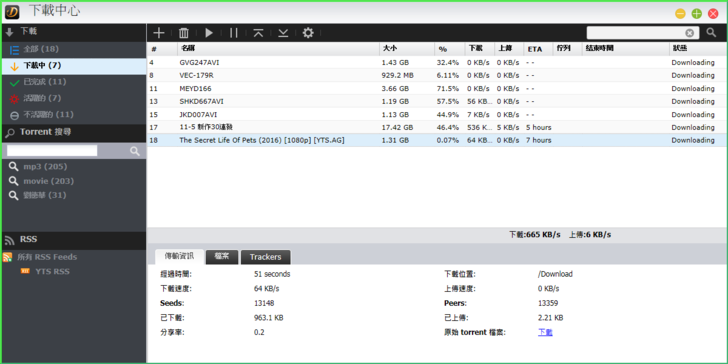 Peers與Seeds數量等,下載速度會依Peers與Seeds數量而有差異,所以最好選擇這兩個數值較多的來下載,也不較不會斷種。