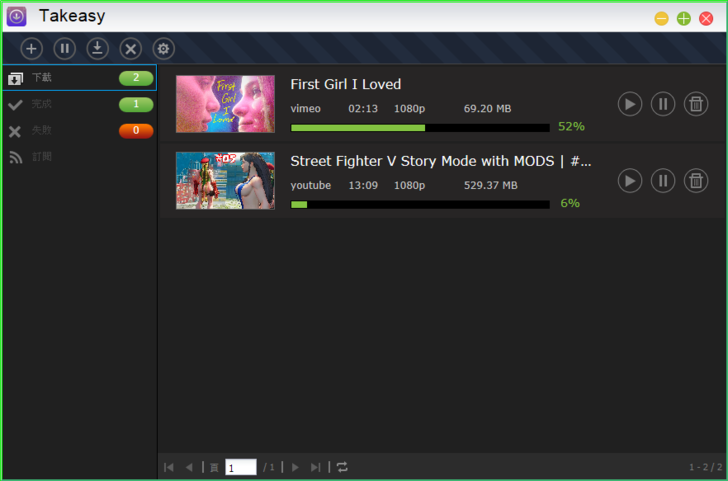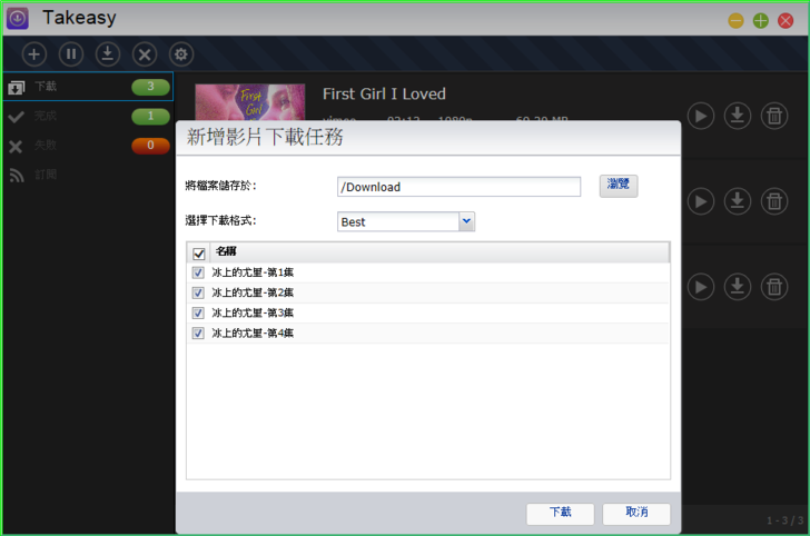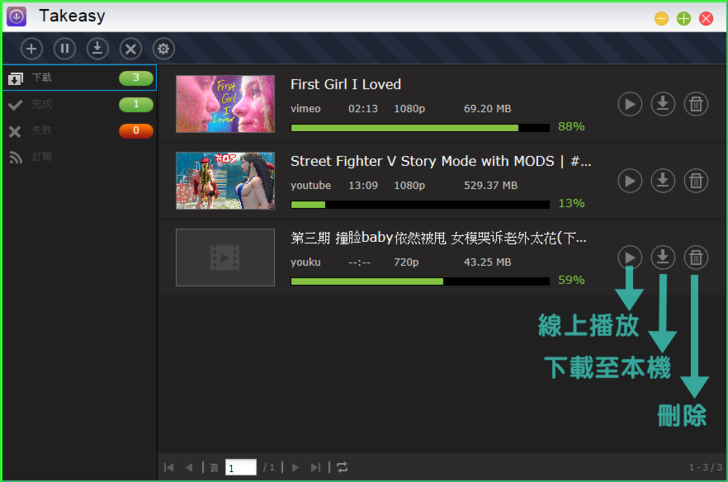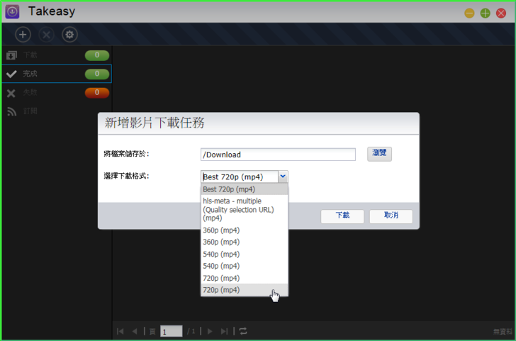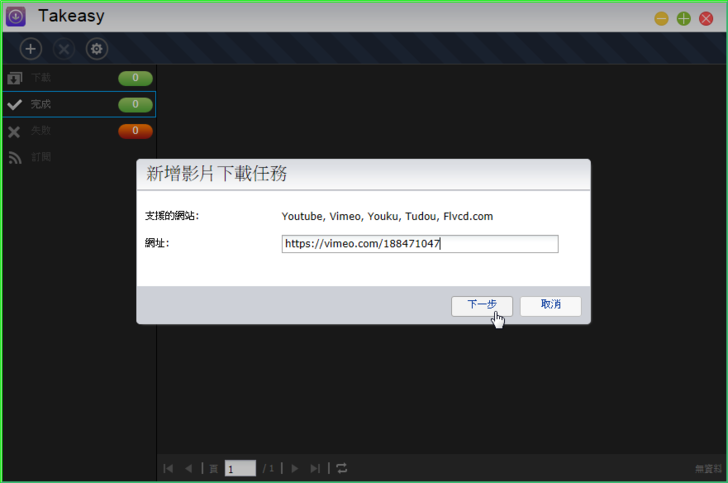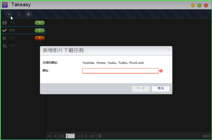【▼】再來介紹 Takeasy,Takeasy 能幫你搞定各式各樣的網路影片備份工作!除了能夠下載備份網路影片與播放清單,影片格式和畫質也任你選擇,想要將整部影片都下載一點都不困難。新增下載任務一樣點擊+,支援的網站有Youtube、Vimeo、Youku、Tudou與 Flvcd.com等。