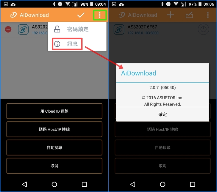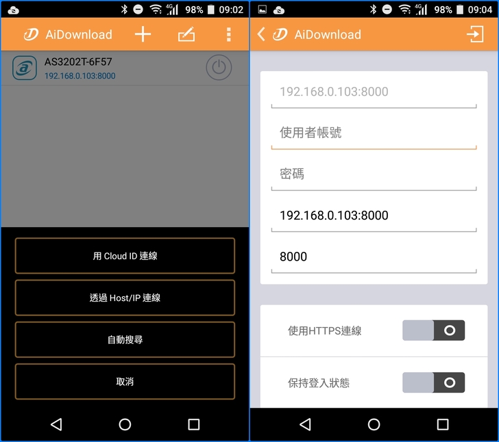 【▼】AiDownload若在區網可以使用IP連線與自動搜尋,而人在外的話,建議可以使用Cloud ID來連線,關於Cloud ID,小編任務一有提到,記得將其功能開啟並輸入帳密來登入到AS3202T中。