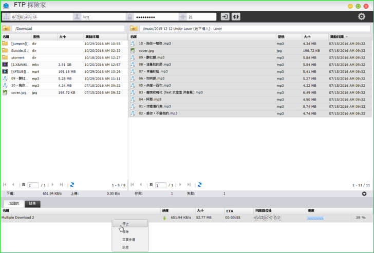 【▼】FTP探險家主畫面下方則顯示檔案的傳輸進度。