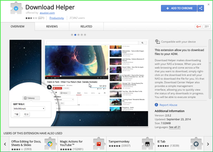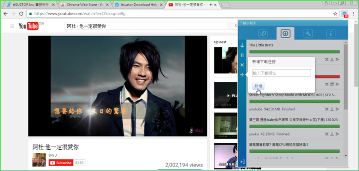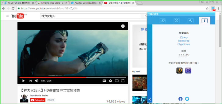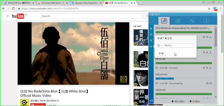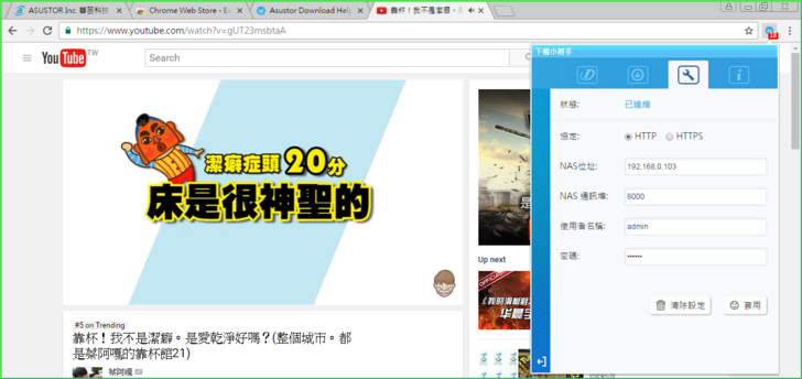【▼】在下載的選項中,還有個貼心的服務,那就是下載中心小幫手,它是Chrome瀏覽器的一個套件,當網頁瀏覽時遇到想下載的檔案,你只需右鍵點選在下載鏈結上即可呼叫 NAS 幫你下載資料,NAS 下載就是這麼的簡單。下載中心小幫手提供了簡易的管理介面讓你可以立即掌握 NAS 目前下載進度,你也可以對目前下載的任務做簡易的管理,其中包含了暫停、開始、刪除甚至是將檔案下載到本地端。