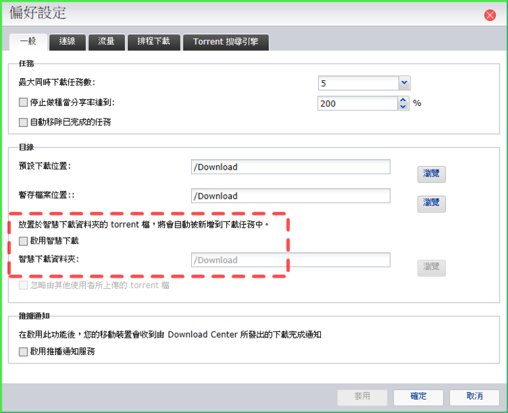 【▼】在下載中心的偏好設定中->一般,最特別的就是智慧下載資料夾,它能當您指定一個 NAS 中的特定資料夾後,未來你便可直接將欲下載的 torrent 傳送至該資料夾,下載中心偵測到後即會自動為你新增下載任務。