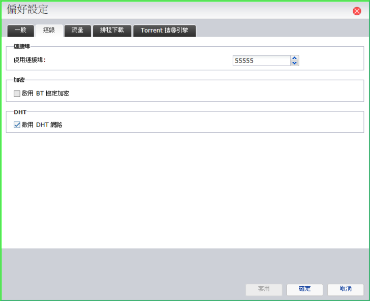 【▼】偏好設定中->連線,提供了有連接埠、啟用BT協定加密與啟用DHT網路,雖然說開啟DHT功能能讓使用者可以在不需要設定Tracker伺服器的情況下,也能下載檔案,但近期PT種子為了反吸血,也禁用DHT網路的設置,所以維持預設值即可。