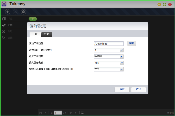 【▼】在 Takeasy偏好設定中,主要能設定下載位置、同時下載任務數、下載速度等基本下載選項。