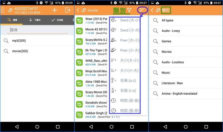 【▼】而下載中心除了下載的功能之外,最強大的就是其搜尋功能,支援BT/HTTP/FTP、Private Tracker、快車下載,讓你不僅能輕鬆的找到所需的資源,更能快速的幫你下載到 NAS 中。透過 AiDowload 您可以隨時隨地利用行動裝置來搜尋並新增下載,彈指之間即可輕鬆地管理下載任務。小編隨便輸入個mp3,就高達205筆的資料,不過這與前述的Torrent 搜尋引擎有關係,越多搜尋引擎,找到的檔案將更多。