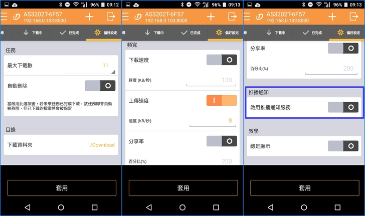 【▼】AiDownload App偏好設定頁面中,主要是任務的相關設定,如同時下載數、上下傳速率限制與推播,AiDownload的推撥通知功能,透過你的行動裝置提醒您,下載已完成。讓你可以自由專注的完成於更重要的任務,不必常常檢查檔案下載完了沒。