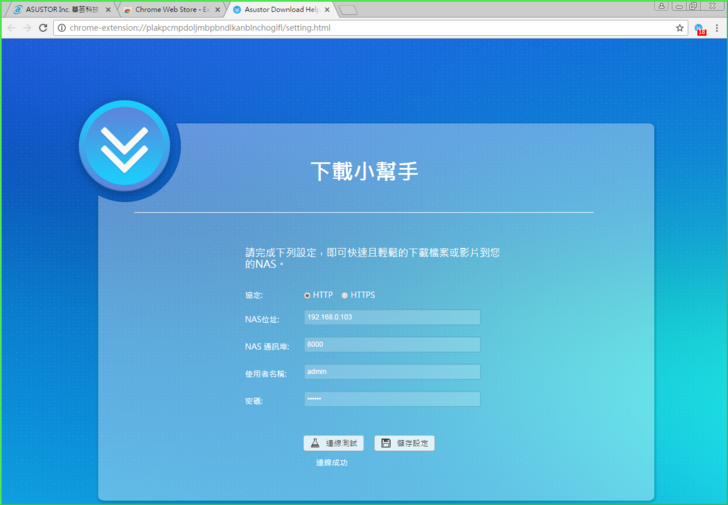 【▼】安裝號套件之後,會來到下載小幫手的設定頁面,主要填入AS3202T NAS的位址,另外也需先在 AS3202T NAS 上安裝下載中心/Takeasy 方可使用。