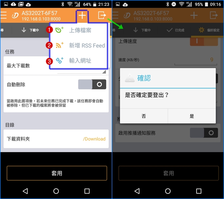 【▼】在AiDownload App登入後的右上角主要功能是上傳種子、新增RSS Feed與輸入磁力連結的網址,最右邊則為登出的選項。