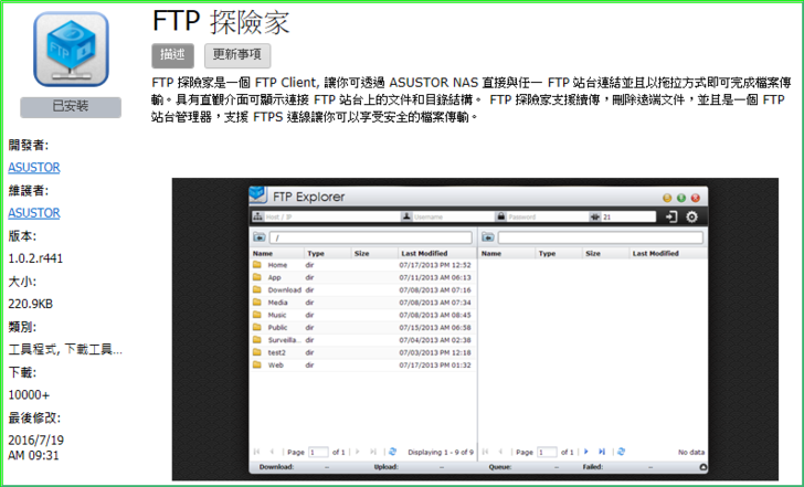 【▼】 雖然FTP已經式微,但還是有很多使用者架設FTP,ASUSTOR FTP探險家簡單來說就是FTP的檔案總管,直觀性的操作介面,開啟 FTP 檔案總管只需點選欲連線的 FTP 站台即可立即連線。