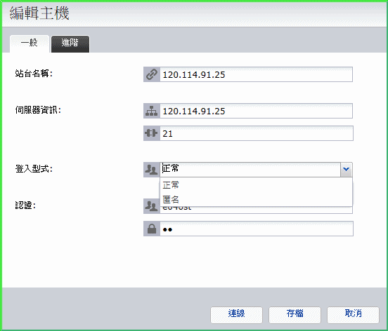 【▼】在主機的設定方面,登入型態可以選擇正常登入或是匿名登入,加密模式有正常、外顯示TLS語陰含式TLS,傳輸模式則有主動、被動或自動偵測,遇檔案已存在時,也可選擇是否要覆蓋。