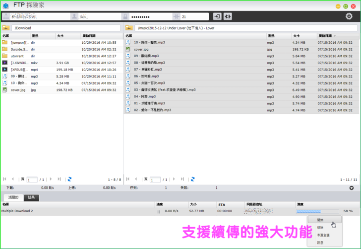 【▼】此外新版本ADM全面支援FTP探險家續傳輸功能。不再需要擔心因網路不穩定而導致檔案要全部重新傳輸,讓傳輸任務可以從中斷的地方開始傳輸,不再浪費時間在已傳輸過的檔案上。