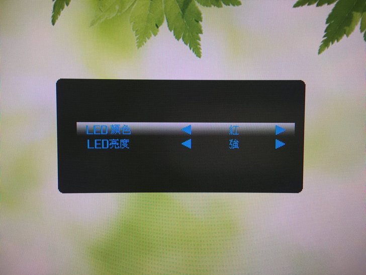 右推的部份是控制螢幕背面與下方的LED氣氛燈,共有紅、綠、藍三個顏色以及弱、中、強與關閉四個階段,這個放在快捷我覺換成別的例如濾藍光的開關或色溫調整可能比較實用一點XD